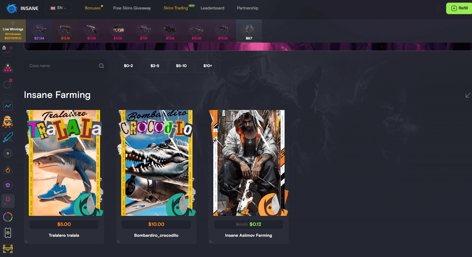 Para que você não perca tempo procurando, analisamos as opções disponíveis e destacamos o serviço Insane. No site oficial do projeto, estão disponíveis dezenas de cases de CS2 incríveis, desde os clássicos até conjuntos de anime. Cada um deles pode conter itens realmente únicos e de qualidade, capazes de agradar tanto iniciantes quanto jogadores experientes de Counter-Strike 2.