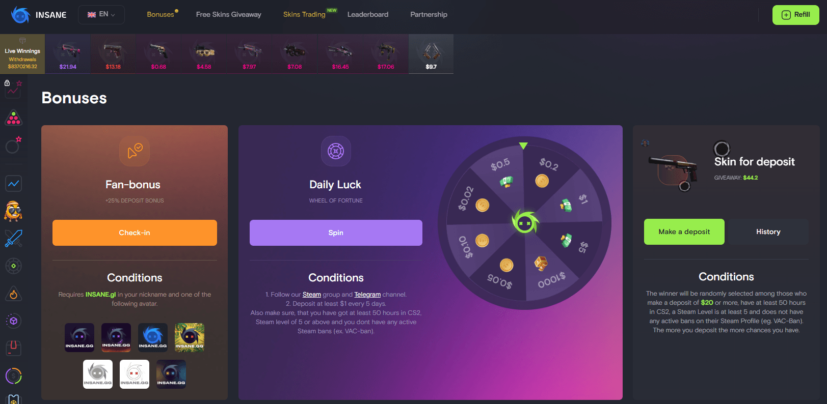 Roda da Fortuna: siga as comunidades do Insane no Telegram e Steam, adicione pelo menos 1 dólar ao saldo a cada 5 dias e ganhe uma rotação diária na roda da fortuna. Nela, você pode ganhar tanto saldo real, quanto moedas internas do site (coins), além de cases de CS2 e skins gratuitos.